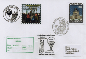 Die philatelistischen Belege der 64. Weihnachts- Ballonpost können, wie immer, über die Briefmarkenfreunde Düsseldorf, c/o Ulrich Rüther, Graf-Recke-Str. 57, 40239 Düsseldorf, Telefon 0211/6 91 41 44, ulrich.ruether@gmx.de, bezogen werden.