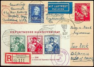 Altdeutschland ist mit über 2000 Losen gespickt, die seltene Marken und Stempel in großer Auswahl enthalten. Hervorzuheben sind die Gebiete Baden, Bayern, Preußen und Württemberg mit vielen seltenen und besonderen Marken, Belegen und Stempeln, die teils seit vielen Jahrzehnten nicht auf dem Markt waren. Deutsches Reich bringt über 600 Lose ab Hufeisenstempel und Brustschilde, darunter viele Briefe/Belege, aber auch Standardmaterial in beiden Erhaltungen. Darunter befinden sich auch Zusammendrucke, Ganzsachen, Zensur- und Propaganda-Belege. Hervorzuheben ist das große Angebot an Flugpost und Zeppelin-Belegen aus aller Welt, insgesamt über 200 Lose mit besonderen und seltenen Stücken. Deutschland nach 1945 ist gewohnt reichhaltig vertreten, was die über 2000 Positionen auch belegen.