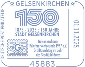 Das Jahr 2025 steht in Gelsenkirchen ganz im Zeichen des Stadtjubiläums. Der Sonderstempel, der vor Ort beim Event-Team der Deutschen Post erhältlich ist, bezieht sich darauf genauso wie ein limitierter Plusbrief Individuell mit Wertstufe 95 Cent. Die aufgedruckte Briefmarke zeigt das offizielle städtische Jubiläumslogo.
