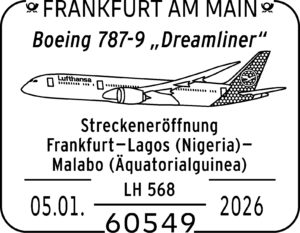 Lufthansa setzt nun ihr neuestes Flugzeug, den „Dreamliner“ von Boeing, ein. Der Flug geht über Lagos (ebenfalls Ölindustrie). Die ILA legt dafür eine Ganzsache mit diesem Flugzeug auf. Der Eindruck zeigt das Wappen von Malabo. Diese Ganzsache kann auf der Strecke von Frankfurt nach Lagos genutzt werden sowie nach Malabo.