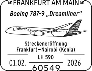 Dazu kommt am 1. Februar noch die Strecke nach Nairobi mit dem „Dreamliner“. Auch hierfür gibt es diese Ganz- sache, jedoch mit dem Eindruck des Wappens von Nairobi.