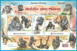 Prag Am 24. September 2025 brachte die Tschechische Post als Eigenausgabe einen Block mit zwei Werten und Zierfeld heraus. Auf dem Block ist die Geschichte einer Gorillagruppe dargestellt, die nach dem Hochwasser im Jahr 2002 begann. Nach der Renovierung des Pavillons wurde darüber nachgedacht, wer dorthin zurückkehren und wer der neue Bewohner werden sollte. Als neuer Anführer der Gruppe wurde der damals zehnjährige Richard gewählt (Marke mit Nominalwert A), der aus dem englischen Zoo Paigton gebracht wurde. Von der ursprünglichen Gruppe blieben das Weibchen Kijivu und ihre Stiefschwester Shinda übrig. Bald wurde klar, dass Kijivu ein Junges erwartete, das kurz vor Weihnachten 2004 geboren wurde. Das Gorillamädchen erhielt den Namen Moja (Marke mit Nominalwert E), was „die Erste“ bedeutet. Kijivu mit ihrer neugeborenen Moja ist das Motiv des Zierfelds. Die Geburt von Moja war eine große Sensation und zog Scharen von Besuchern an, um sie zu sehen. Als Siebenjährige reiste sie Ende 2011 an ihren neuen Lebensort ins spanische Cabarceno. Dort lernte sie das Männchen Niki kennen, von dem sie im folgenden Jahr trächtig wurde. Nach Prag kehrte dann ihre Tochter Duni zurück, die in der neuen Anlage des Pavillon-Reservats Dja bereits ihre Großmutter Kijivu getroffen hat. Die größte Attraktion sind derzeit die beiden Neuzugänge – Mobi, die Tochter von Duni, und die jüngste Gaia, ebenfalls eine Tochter von Kijivu. In der linken oberen Ecke des Bildausschnitts wacht das älteste Mitglied in der Gruppe, Kamba, die bereits über fünfzig Jahre alt ist und aus Kamerun stammt, wo sie Wilderern entrissen wurde. Symbolisch befindet sich neben dem ältesten Gorilla Kamba das Porträt der jüngsten Gaji, die vor Kurzem ein Jahr alt geworden ist.